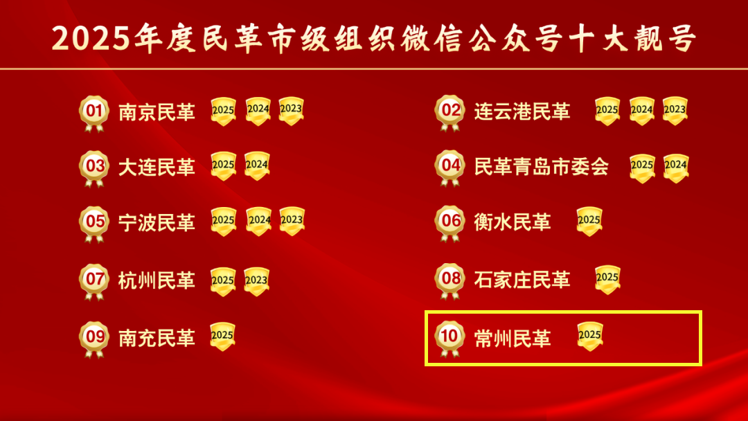 12月3日,在团结报社2025年度新闻舆论工作表彰会上,2025年度“民革市级组织微信公众号十大靓号”、“民主党派市级组织微信公众号三十大靓号”重磅发布。“常州民革”微信公众号进入民革市级组织微信公众号前十位、民主党派市级组织微信公众号前三十位。