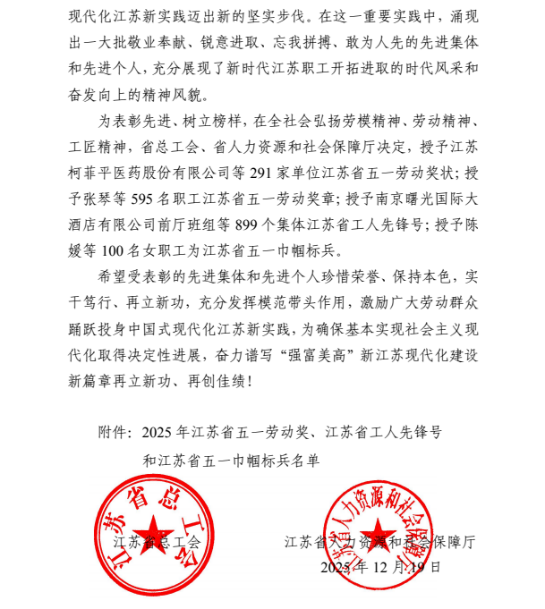 近日,江苏省总工会、江苏省人力资源和社会保障厅发布《关于表彰2025年江苏省五一劳动奖、江苏省工人先锋号和江苏省五一巾帼标兵的决定》。民革党员陈寅创立的格力博(江苏)股份有限公司荣获“江苏省五一劳动奖状”称号。